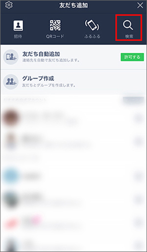 LINEアプリを起動し、「ホーム」→「友達追加」→「検索」とタップし、