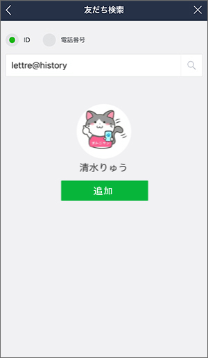 検索窓に「lettre@history」と入力して検索。「lettre@history」を検索して、『清水りゅう』のアカウントが表示されますので、友達に追加してください。